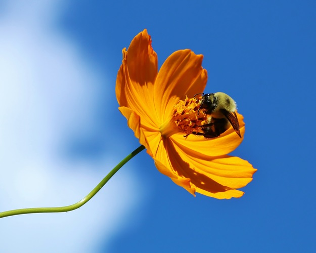 Cloud Stem Flower Bee Sky: photo of bumble bee on yellow cosmos flower taken near Marmora, Ontario. Photograph copyright Matthew King. E-mail birdsandbeesandblooms@gmail.com to inquire concerning use or purchase.