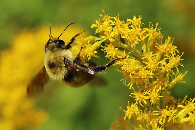 Tumble Bee: photo of bumble bee with goldenrod taken near Marmora, Ontario. Photograph copyright Matthew King. E-mail birdsandbeesandblooms@gmail.com to inquire concerning use or purchase.