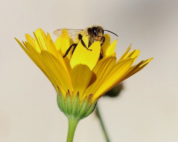 Bumble Bee Climbing Out of Calendula Flower. Photo taken near Marmora, Ontario. Photograph copyright Matthew King. E-mail birdsandbeesandblooms@gmail.com to inquire concerning use or purchase.