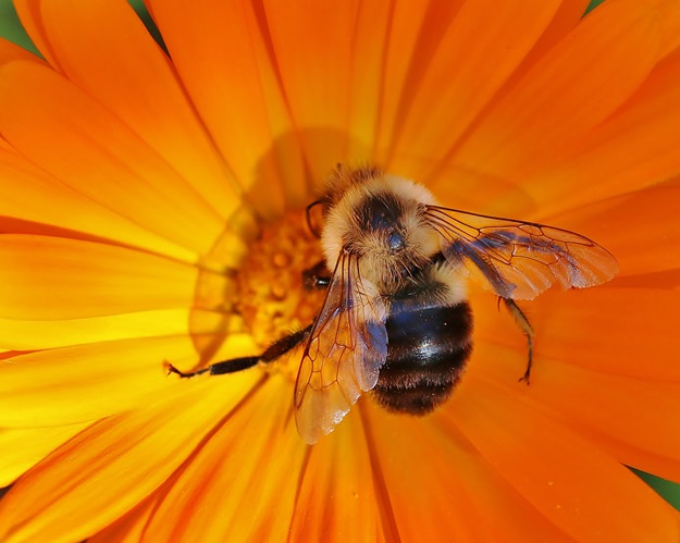 Bumble Bee and Shadow: photo of bumble bee in calendula flower taken near Marmora, Ontario. Photograph copyright Matthew King. E-mail birdsandbeesandblooms@gmail.com to inquire concerning use or purchase.
