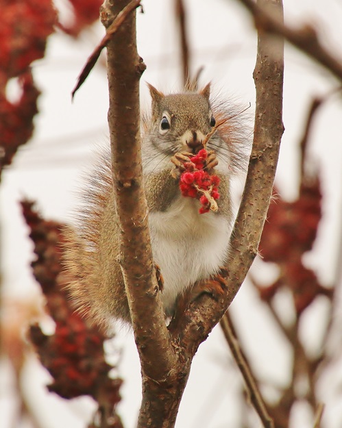 Red Squirrel with Sumac Berries. Photo taken at Centennial Park, Etobicoke, Ontario. Photograph copyright Matthew King. E-mail birdsandbeesandblooms@gmail.com to inquire concerning use or purchase.