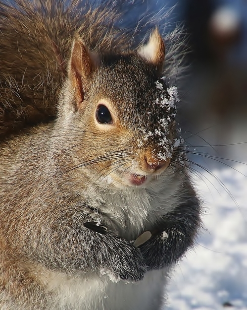 Squirrel with Snow and Sunflower Seeds and Something to Say: photo of eastern grey squirrel taken near Marmora, Ontario. Photograph copyright Matthew King. E-mail birdsandbeesandblooms@gmail.com to inquire concerning use or purchase.
