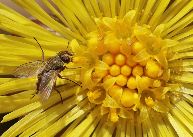 Little Tachnid Fly in Coltsfoot Flower. Photo taken near Marmora, Ontario. Photograph copyright Matthew King. E-mail birdsandbeesandblooms@gmail.com to inquire concerning use or purchase.