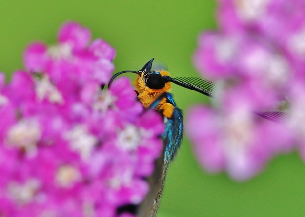 Virginia Ctenucha Moth with Pink Yarrow Flowers. Photo taken near Marmora, Ontario. Copyright Matthew King. E-mail birdsandbeesandblooms@gmail.com to inquire concerning use or purchase.